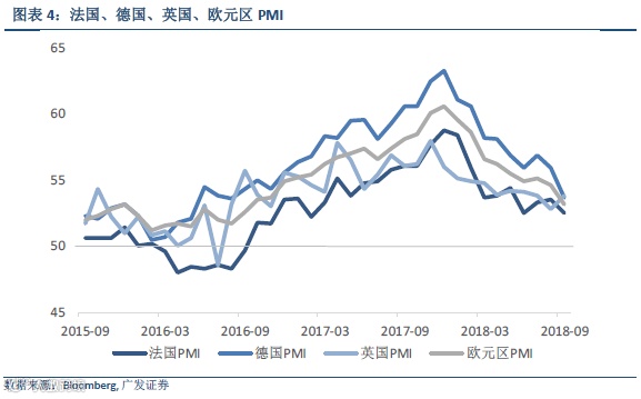 欧元区9月制造业PMI报53.2,呈继续下降的趋势,表明“美强欧弱”格局仍将持续。主要原材料购进价格上升与出口订单下降,是拖累9月欧盟制造业PMI指数下降的主要原因。而原材料购进成本上升,主要来源于以美元计价的钢铁与石油产品的价格上升。分国家来看,法国9月制造业PMI报52.5,低于前值53.5。德国9月制造业PMI报53.7,低于前值55.9,创25个月以来的新低。英国9月制造业PMI报53.8,高于前值52.8。