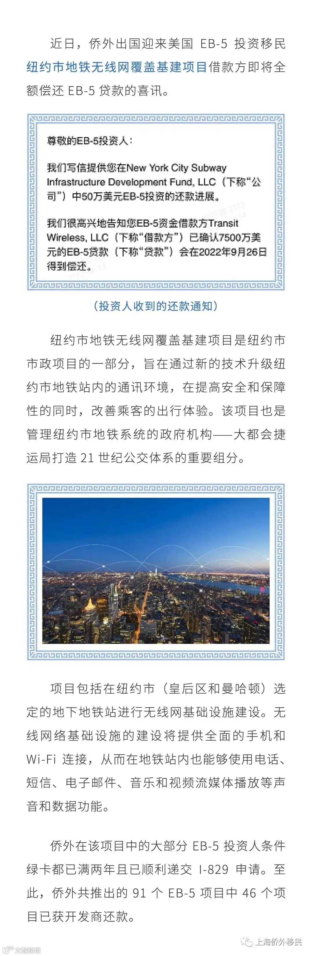 导读:侨外美国EB-5纽约市地铁无线网覆盖基建项目借款方即将全额偿还EB-5贷款。
