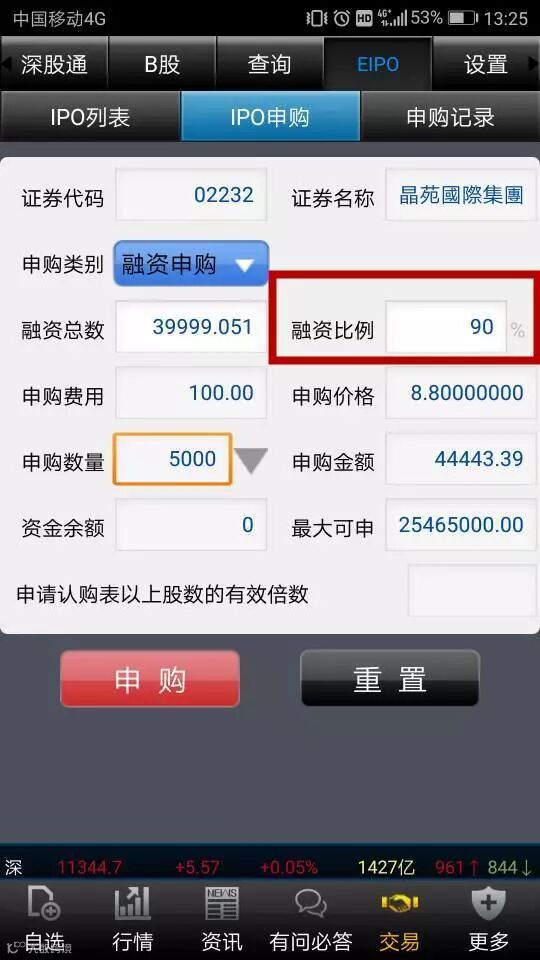 如果您选择的申购方式是融资申购,将进入以下界面,填写融资比例(港股新股部分融资比例可达90%)。