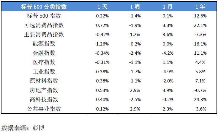 ▶ 板块方面,表现最好为能源板块,升1.26%,其次为可选消费品板块,升0.72%。