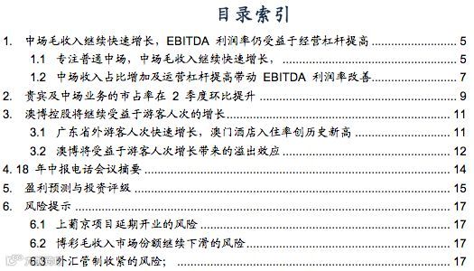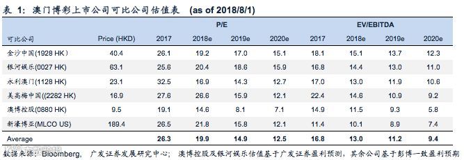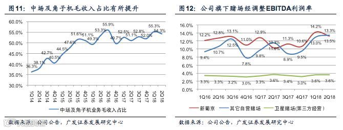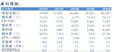 我们分别上调18-20年经调整EBITDA预测4.1%/3.6%/1.5%。这主要是因为我们认为公司专注于普通中场的战略成效显著,并上调了中场毛收入增速的预测。公司当前市值对应18/19年EV/EBITDA分别为11.5x和9.3x,我们认为上葡京项目的估值会开始逐步反应到公司的市值中,维持对公司的买入评级。