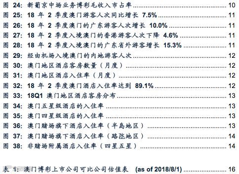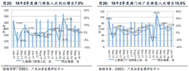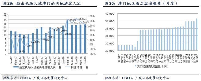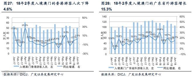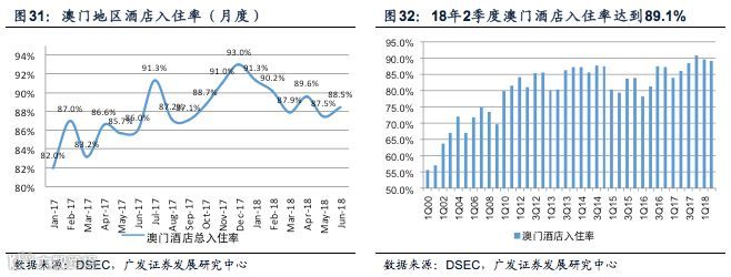随着广东省外内地游客人次的快速增长,澳门地区酒店入住率在18年2季度继续创下历史同期新高。据澳门统计局披露,18年2季度入境澳门的游客人次达到826.8万人,同比增长+7.5%。其中入境澳门的内地游客人次达到567.4万人次,同比+13.1%。而其中来自广东省外的内地游客人次达到340.6万人,同比+15.3%,是澳门游客人次增长的主要驱动因素。从入境方式看,18年2-6月经由机场入境的内地游客人次(主要为广东省外游客)的同比增速保持在40%以上,显示出广东省外游客前往澳门旅游的需求仍然强劲。相较于广东省及香港的游客,广东省外的内地游客更倾向于在澳门过夜,因此也倾向于在赌场内停留更长的时间。受游客人次增长的推动,18年2季度澳门地区酒店客房酒店入住率达到89.1%,为历史上2季度澳门地区酒店入住率的最高水平。这是澳门地区酒店入住率自17年4季度开始连续第3个季度创下历史同期新高。