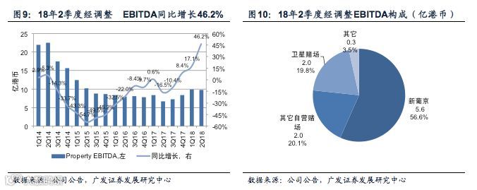 2季度经调整EBITDA为9.72亿港币,同比增长46.2%,其中新葡京是主要贡献来源。但是去年2季度公司的其它自营娱乐场及卫星娱乐场分别有0.22亿港币和0.52亿港币的非经常性支出。如果去年同期的经调整EBITDA不考虑非经常性支出,那么18年2季度,公司经调整EBITDA的同比增速为31.5%。分物业来看,新葡京实现EBITDA 5.34亿港元(同比增长43.2%),占比达到54.9%,是经调整EBITDA的最主要来源。在不考虑去年2季度非经常性支出的情况下,其它自营娱乐场和卫星娱乐场2季度的EBITDA分别同比增长33%及60%,也对公司经调整EBITDA的增长有帮助。