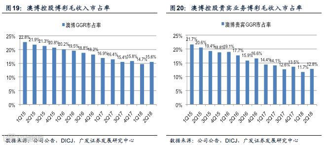 公司自2010年开始博彩毛收入的市场份额持续下滑,这主要是因为自2009年至今澳门地区新建的赌场均位于路氹地区,吸引更多的赌客选择前往路氹地区,而澳博控股的绝大多数博彩资产均位于澳门半岛。在2017年4季度公司博彩毛收入的市占率略有回升。但是在公司的上葡京项目建成之前,澳博控股的市占率仍然存在继续下滑的风险。