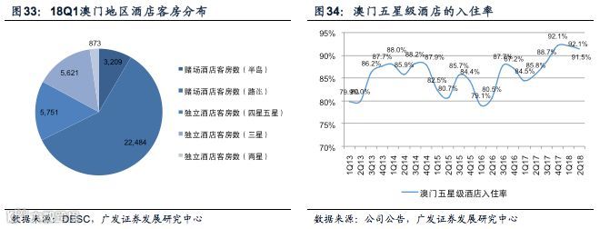 目前澳门地区赌场附属酒店的入住率已经接近饱和,但是独立酒店的入住率仍有提升空间。截止18年1季度,澳门地区赌场附属酒店(定义为博彩上市公司所拥有的酒店)和独立酒店(定义为非博彩上市公司所拥有的酒店)客房数量分别为25693间和12245间。其中,澳门博彩上市公司旗下的所有附属酒店均为五星级酒店。在18年1季度,澳门地区五星级酒店入住率已达到92.1%,而其中澳门半岛和路氹地区的赌场附属酒店的入住率更是分别达到96.2%和95.8%。除了金沙旗下的部分酒店及新开业的美狮美高梅以外,绝大多数其它赌场附属酒店的入住率在2018年1季度均已经接近100%。但是澳门地区独立酒店的入住率仍有一定的提升空间。