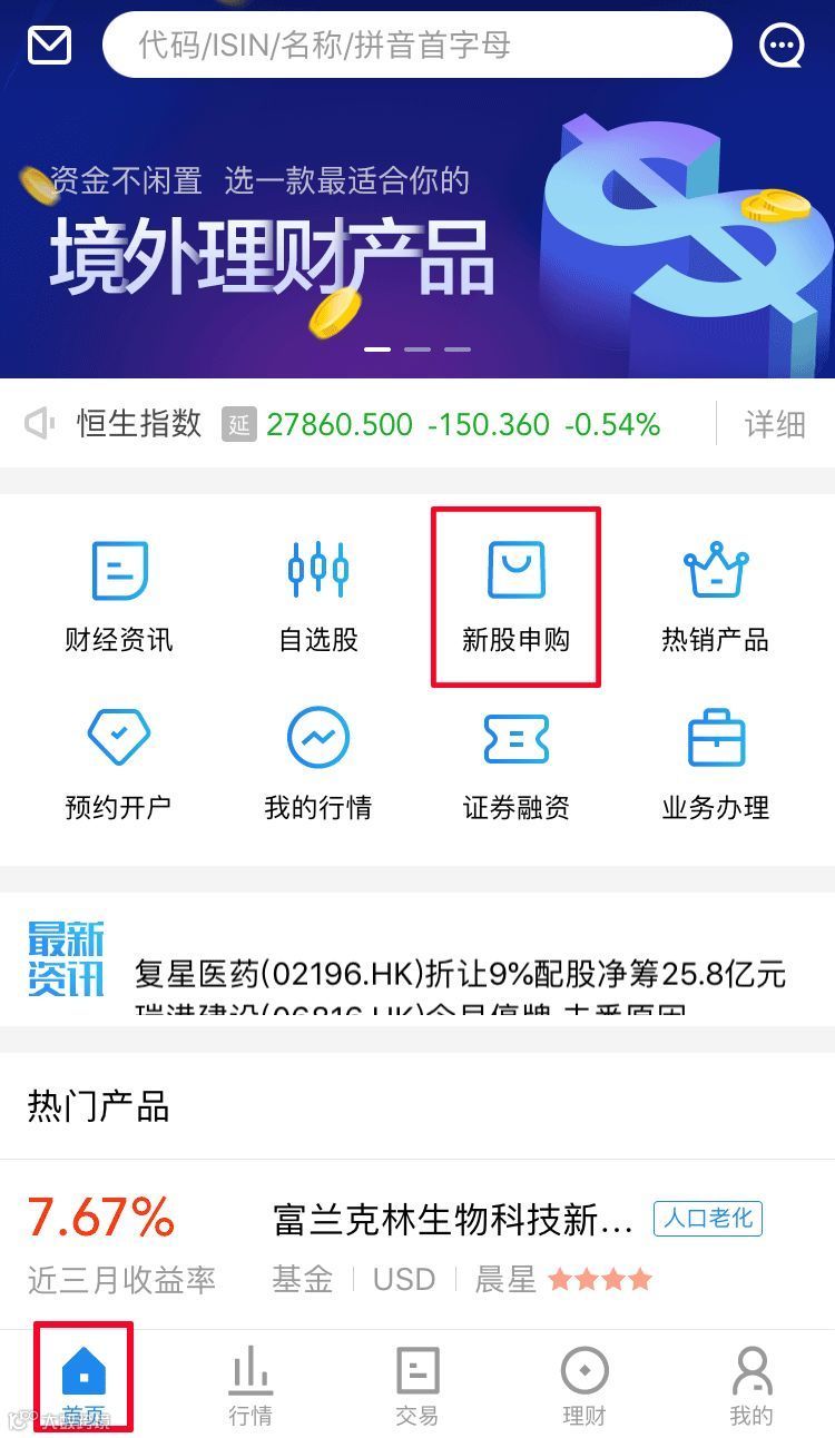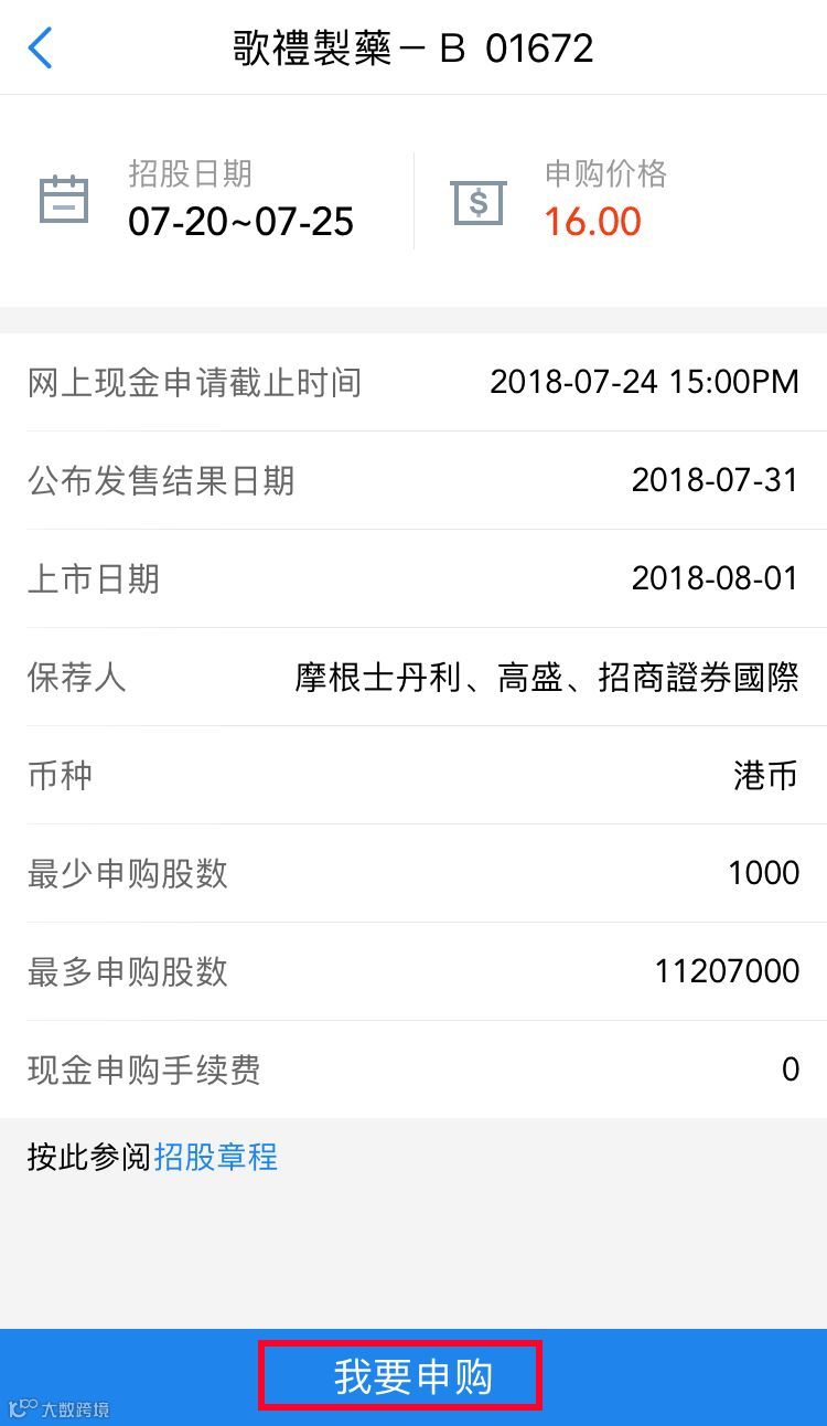 进入“易淘金国际”APP,登录个人交易账户,在APP首页界面的上方,如图①点击选择“新股申购”;进入新股申购列表页面后,选择您要申购的新股,如图②中的“歌礼制药-B 01671.HK”;随之页面跳转到“歌礼制药-B 01671.HK”的招股详情页,点击“我要申购”。