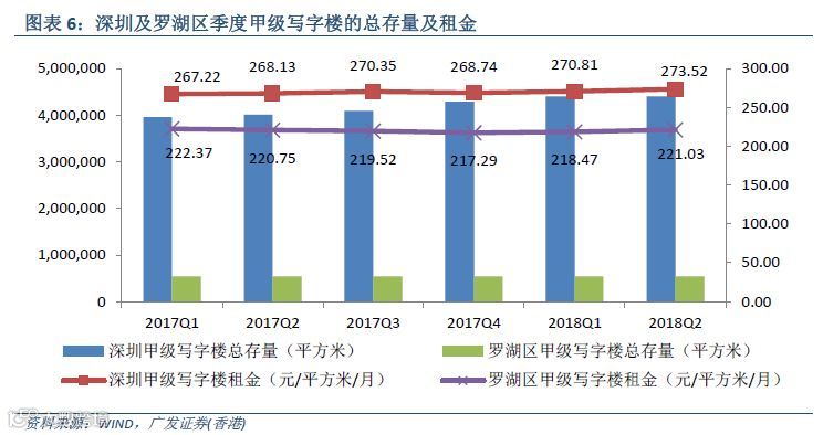 另外,罗湖区季度甲级写字楼连续18个月保持541,813平方米的总存量,占深圳整体的比重平均为12.9%。从价格上来看,罗湖区2Q18季度甲级写字楼租金为221.03元/平方米/月,低于深圳的整体平均水平273.52元/平方米/月;同时,罗湖区甲级写字楼租金走势非常平缓,2Q18季度租金同比涨幅仅为0.1%,而同期深圳市甲级写字楼租金同比上涨2.0%,说明罗湖区写字楼的需求落后于深圳市的平均水平。