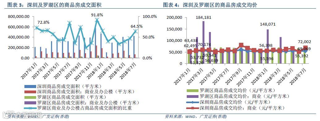 2017年至今,罗湖区商业及办公楼的商品房成交价格比较稳健,总体保持温和上扬的趋势;同时,罗湖区的商品房成交均价均超过深圳的商品房成交均价水平。