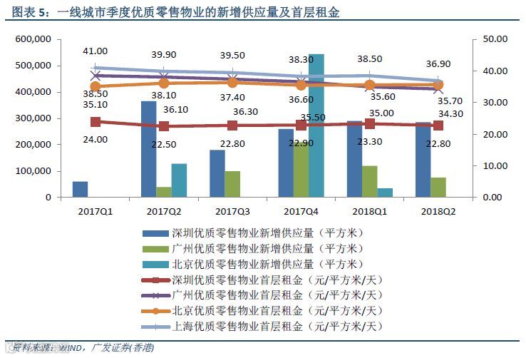 2017年一季度至今,深圳季度优质零售物业的新增供应量波动幅度偏缓,整体水平维持在240,167平方米,在四个一线城市中处于领先位置。同时,2017年以来深圳季度优质零售物业的首层租金在22.50元-24.00元/平方米/天,远低于上海、广州及北京的的水平。