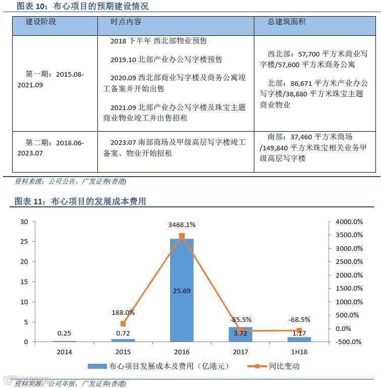 布心项目位于深圳市罗湖区东晓街道,临近地铁3、5号线水贝站和布心站,连接深圳商业中心区、东西部及中部等主要地区,具备一定的位置优势。截至2018年一季度,布心项目发展的西北部土地总楼面面积约166,000平方米,其中可供出售总楼面面积约116,000平方米;布心项目发展的南部和北部土地,计划分别建设高度约180米和300米的写字楼,以及一个横跨南北部的购物中心。截止2018年上半年末,布心项目的发展成本及费用累计约32.30亿元。