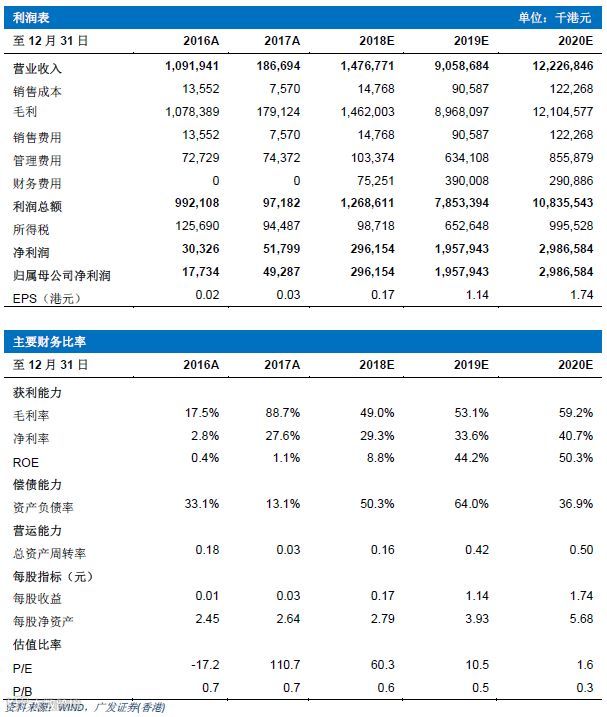 5)投资建议:由于新注入的广州项目以及布心项目逐渐接近可售状态,我们认为公司将在未来几年迎来业绩爆发期。我们估计,公司开发型物业和持有型物业的经调整资产现值分别为64亿港元和45亿港元,预计将在2019年和2020年为公司带来91亿和122亿港元的营收,同比分别增511%和13%。公司资产净值为87亿港元,相当于每股NAV5.06港元,对应当前股价相当于折让66%,而行业的平均折让水平为50%。同时,公司最新的市净率为0.6X,低于行业平均0.8X的估值水平。我们认为,综合考虑公司的国企背景优势、财务优势、规模劣势、区域集中风险和股票流动性缺陷因素,公司的股价依旧有较好的安全边际。