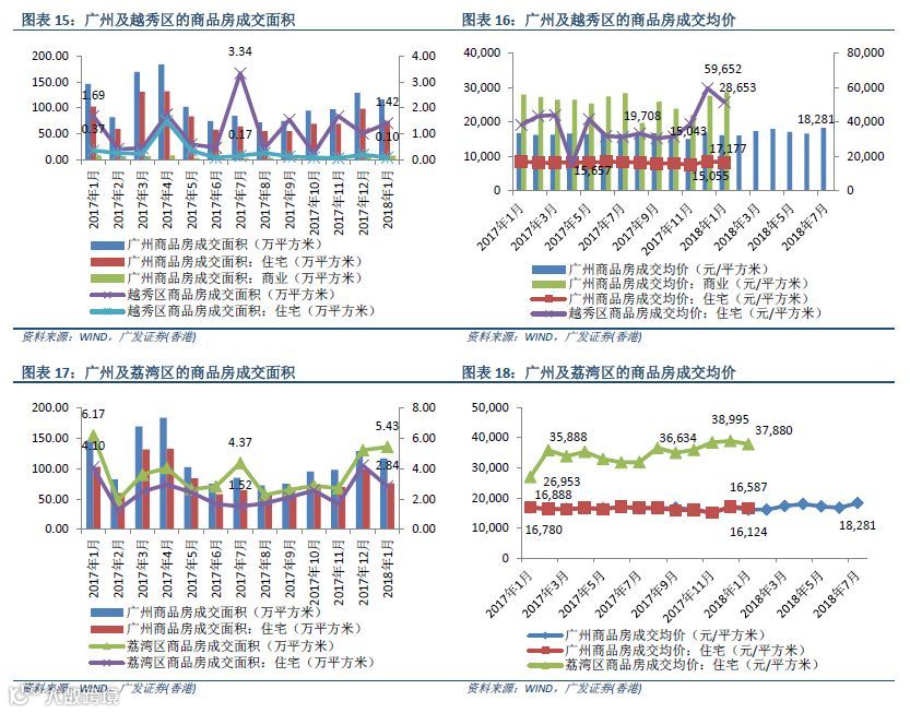 2017年至今,广州的住宅商品房成交均价稳步上升,而越秀区和荔湾区的住宅商品房成交均价上扬趋势更为显著,同比涨幅巨大;同时,该区域的商品房成交面积占广州的商品房成交面积的比重很低,显示作为广州中心区域,越秀区和荔湾区的物业具有明显的稀缺性。