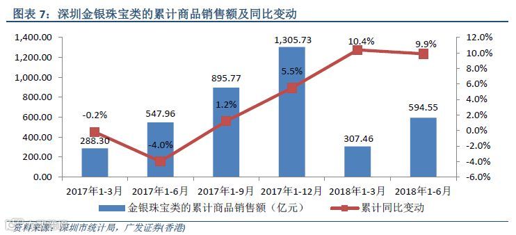 自2017年一季度以来,深圳金银珠宝类的累计商品销售额整体呈上升趋势,尤其是下半年的增幅显著,全年的同比增幅由负转正,至5.5%。2018年一季度和二季度,深圳金银珠宝类的累计商品销售额分别为307.46亿元和594.55亿元,同比增长10.4%和9.9%,说明深圳市的金银珠宝类的商品销售情况较好,未来相关的市场表现值得关注。