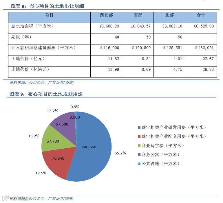 2016 年 6 月,集团以总代价约22.67 亿元(相当于约26.83亿港元)收购相关的土地使用权,并拟转换布心土地为商业用途,其中总土地面积约66,526平方米,计入容积率总建筑面积约432,051平方米并主要涉及5类土地规划用途,地下可开发商业用房 30,000 平方米;同时,布心项目的土地估值为61.11亿元(相当于约72.34亿港元)。