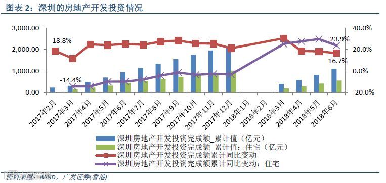 2017年至今,深圳的房地产开发投资完成额的增长情况较为稳健。其中,2017年,深圳市于住宅用途方面的房地产开发投资完成额同比为负增长,但跌幅逐渐缩小,在2018年上半年的累计同比变动均为正值,达26.7%。在房地产开发投资保持增长态势的前提下,深圳市正在加快住宅用途的房地产开发投资节奏。