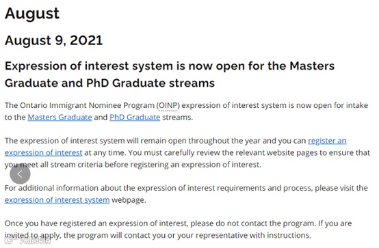 值得注意的是,8月9日下午,2021安省硕士、博士毕业生省提名类别也正式开放申请。这两个类别将使用意愿打分系统(Expression of Interest)接受新的申请,并且保持全年开放。至此,今年安省省提名的五大类别均已开放!