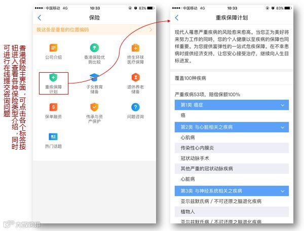 香港保险功能目前主要提供几类热门保险类型的详细介绍,用户可通过九宫格子功能选择所感兴趣的保险类型进入查阅,同时,对香港保险持有兴趣亦可直接在线提交问题咨询。
