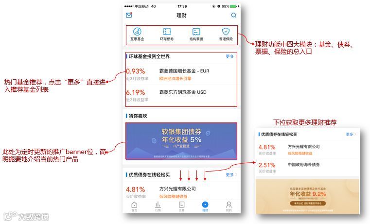 ② 另外,理财主页面共有四处推荐位,两处banner推荐以及两处热门产品列表推荐,为用户提供更多实时更新的热门产品选择。
