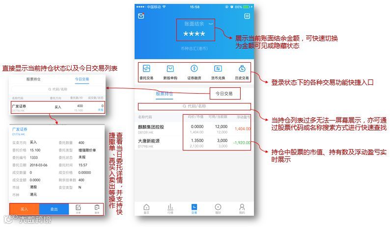 交易功能主要支持一个账号完成跨市场股票下单,同时支持港股新股申购、币种兑换、融资额度查询等完整的功能操作。