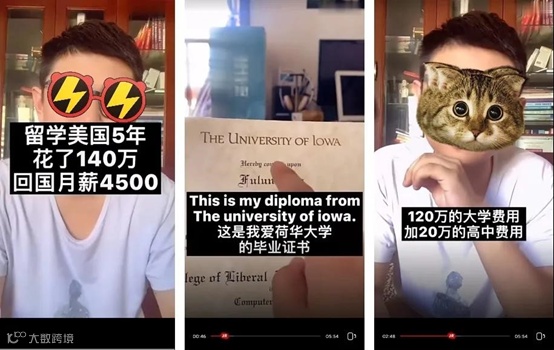 这位留学生是美国爱荷华大学计算机专业毕业的。爱荷华大学在全美高校排名中位列第71,虽说不是一所顶尖大学,但也绝非克莱登大学那种骗子学校或野鸡大学。据悉,这所大学一年的学费在26000美元以上,折合成人民币大概17万。再加上在美国读高中的花销以及日常开销,前前后后他花了差不多140万人民币。