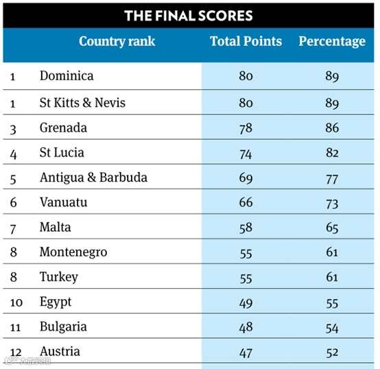 近日,这个由英国《金融时报》旗下的《专业财富管理》(PWM) 杂志发布的指数,更新了2021的投资入籍项目排名,在综合比较中,加勒比海国家继续保持了历年来的领先地位,多米尼克与圣基茨和尼维斯均在排名中并列第一。