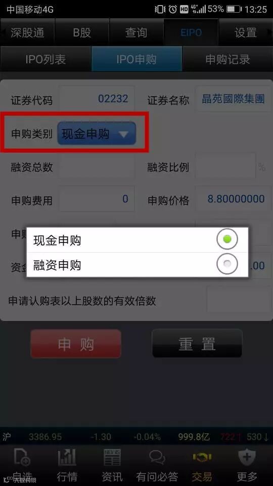 现金申购是客户用自有资金申购新股,在“申购类型”选择“现金申购”,然后在右边点击选择自己想申购的数量,最后点击“申购”按键。