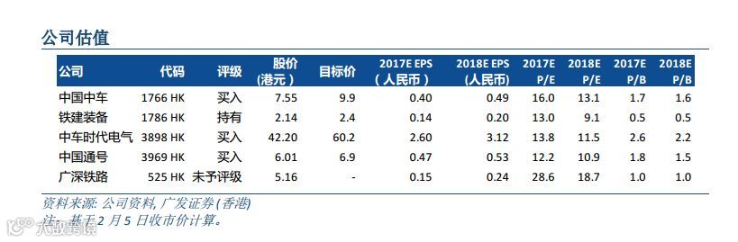 中国中车和中车时代电气仍为首选 中车时代电气将于2018年3月26日公布2017年业绩。我们预测公司2017财年净利润同比增长5%,2018年增速升至20%。中车时代电气目前股价对应11.5倍 2018年预测市盈率。 我们维持“买入”评级和目标价60.20港元。 同时我们预计中国中车的2017年净利润将下滑4%,但预计公司净利润将于2018年实现22%的同比增长。公司目前股价对应13.1倍2018年预测市盈率。维持“买入”评级和目标价9.90港元。