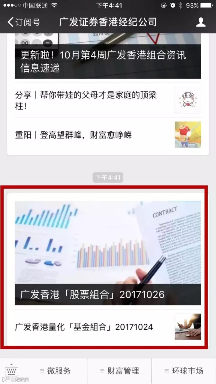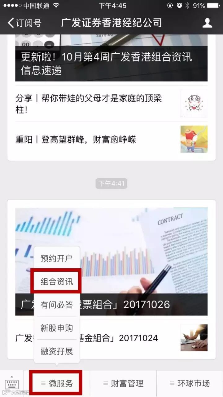 关注“广发香港经纪公司”,进入公众号号,打开自定义菜单微服务-组合资讯。