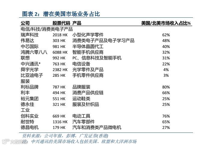 计算机和消费电子产品很有可能被征税 根据对美国相对其他国家,尤其是相对中国的贸易赤字分析,我们认为最有可能被征收重关税的是计算机和消费电子产品,其次为纺织品和服装,以及金属。在计算机和消费电子产品板块中,瑞声科技(2018 HK, 未予评级)有62%的收入来自美国/北美市场。其他美国出口占比较大的公司包括如伟易达(303 HK, 未予评级)、中芯国际(981 HK,未予评级)、鸿腾六零八八(6088 HK,未予评级)和联想(992 HK,未予评级)。纺织和服装板块方面,利标品牌(787 HK,未予评级)和利丰(494 HK,未予评级)有较高的美国业务收入占比。我们认为投资者对于目前贸易紧张局势的反应过于淡定,应该对此保持警惕并密切关注局势变化。