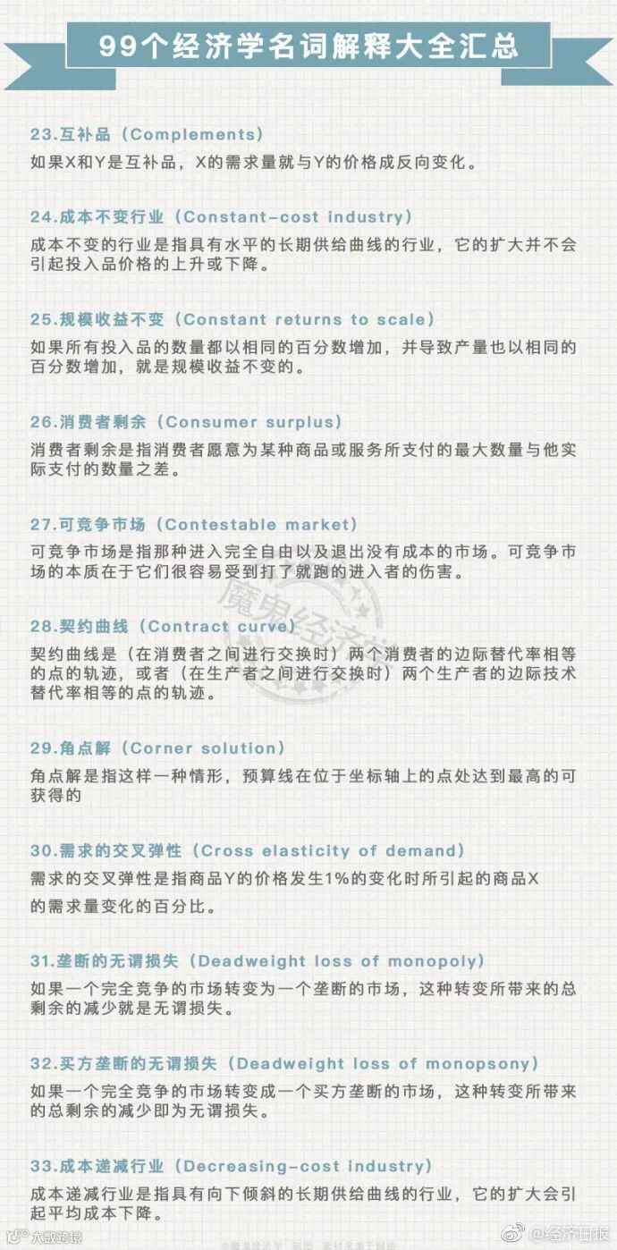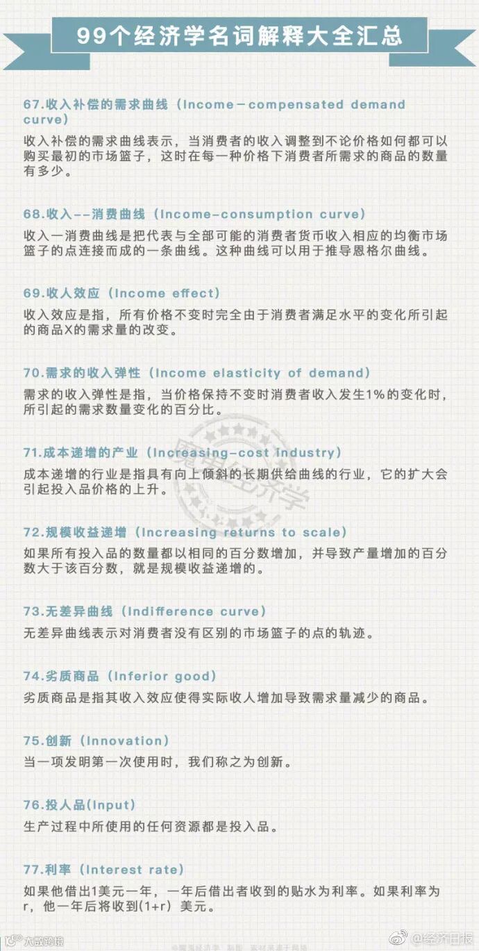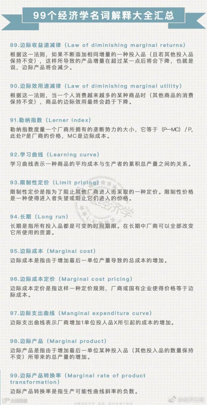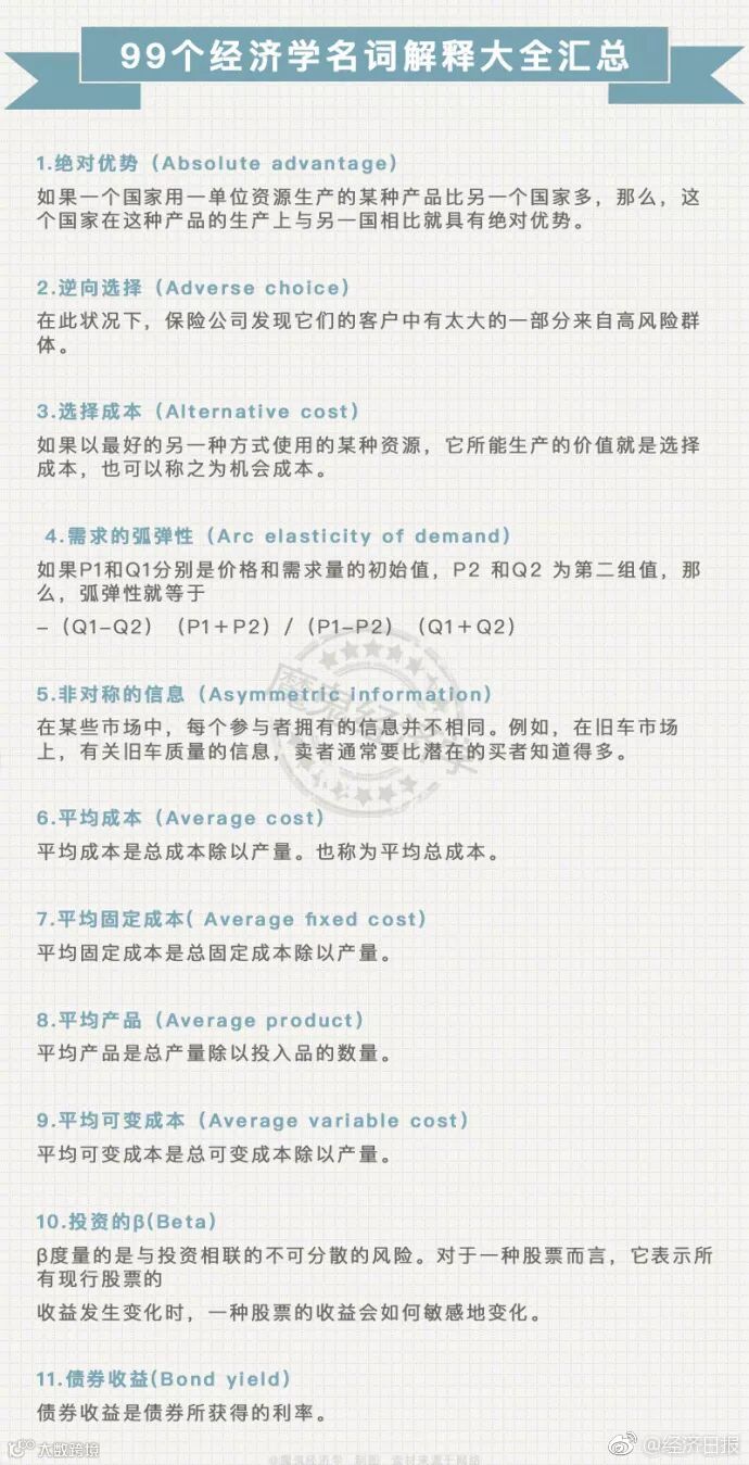 绝对优势、逆向选择、选择成本、需求的弧弹性.....为你总结推荐----99个经济学名词解释大全汇总!你一定用得到!转发学习!