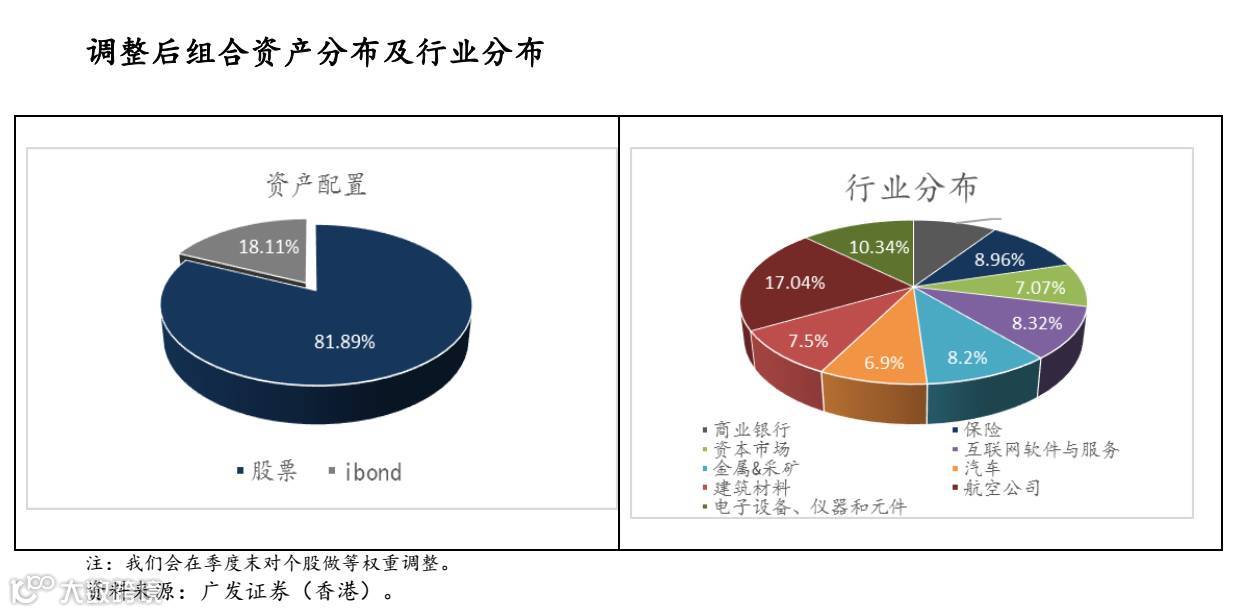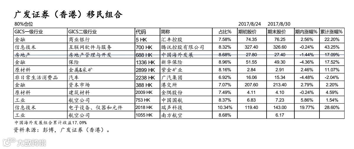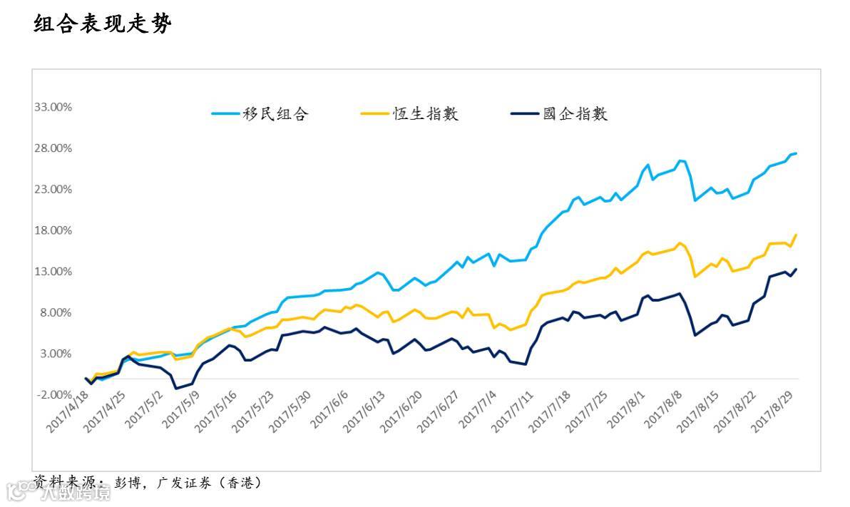 广发证券(香港)经纪有限公司(「广发证券(香港)」)自2017年4月18日开始推出广发证券(香港)移民组合,组合起始净值为1000万港元。起始组合中选取10只股票平均配置,组合个股配置比例会在每季度末重新等权重调仓。新加入股票均以调整日收盘价计入组合。如果某只个股仍在组合当中,我们将以每日收盘价来计算表现。调出组合股票之后仍有较大可能再次调入组合,组合经理会根据个股基本面和股价情况考虑择时因素。本组合遵循自下而上的选股策略,组合将每周更新。移民组合在对仓位进行调整时会考虑投资移民客户减仓需要14个自然日买回的入境处规定,我们建议客户将现金部分买入政府ibond作为现金管理。
