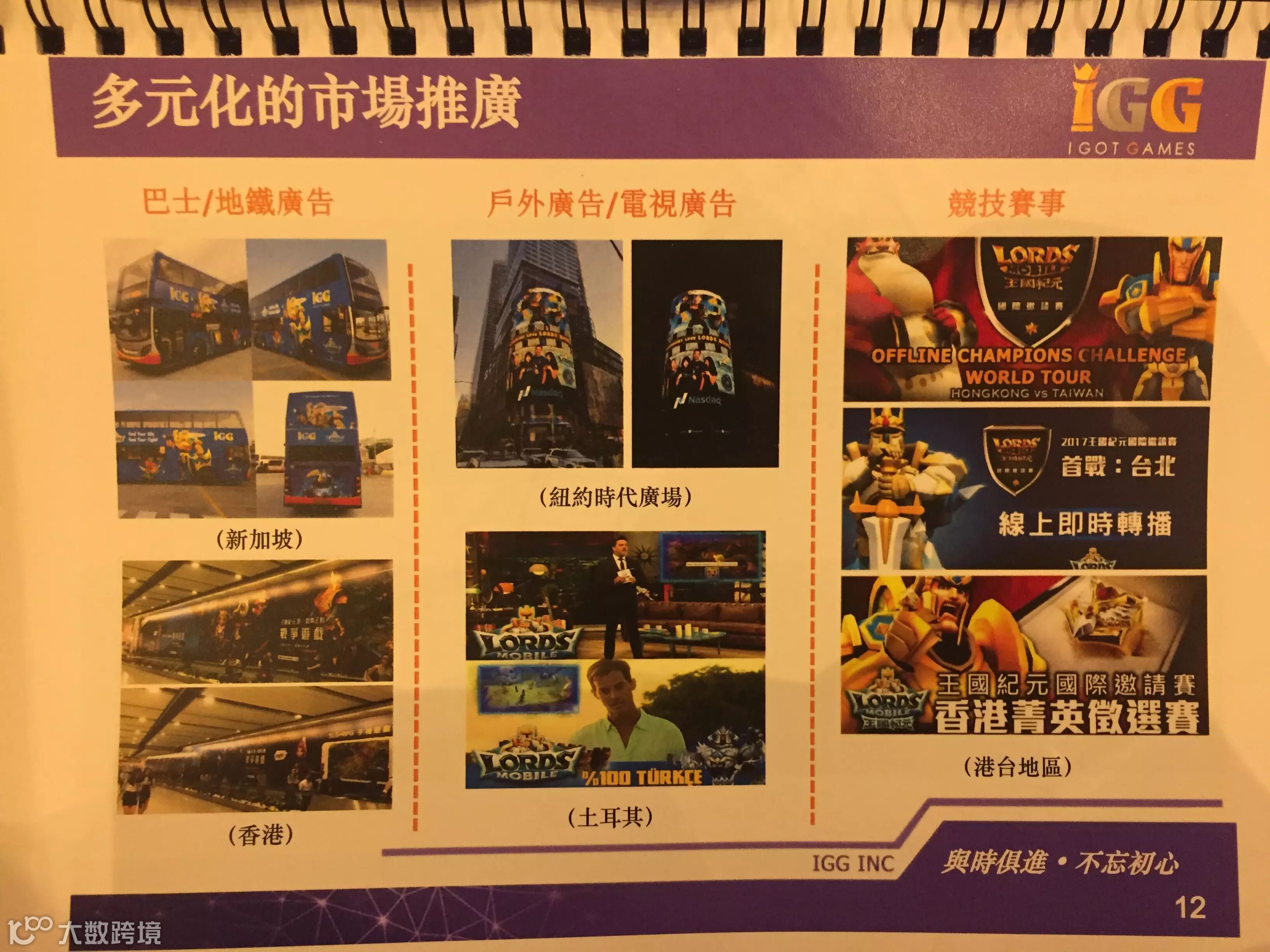 IGG在新加坡、香港地区进行巴士、地铁广告,在纽约时代广场承包大屏广告,在土耳其与电视台合作。同时,在竞技赛事方面,IGG在台湾香港分别举办了两场精英挑战赛,均取得不错效果。