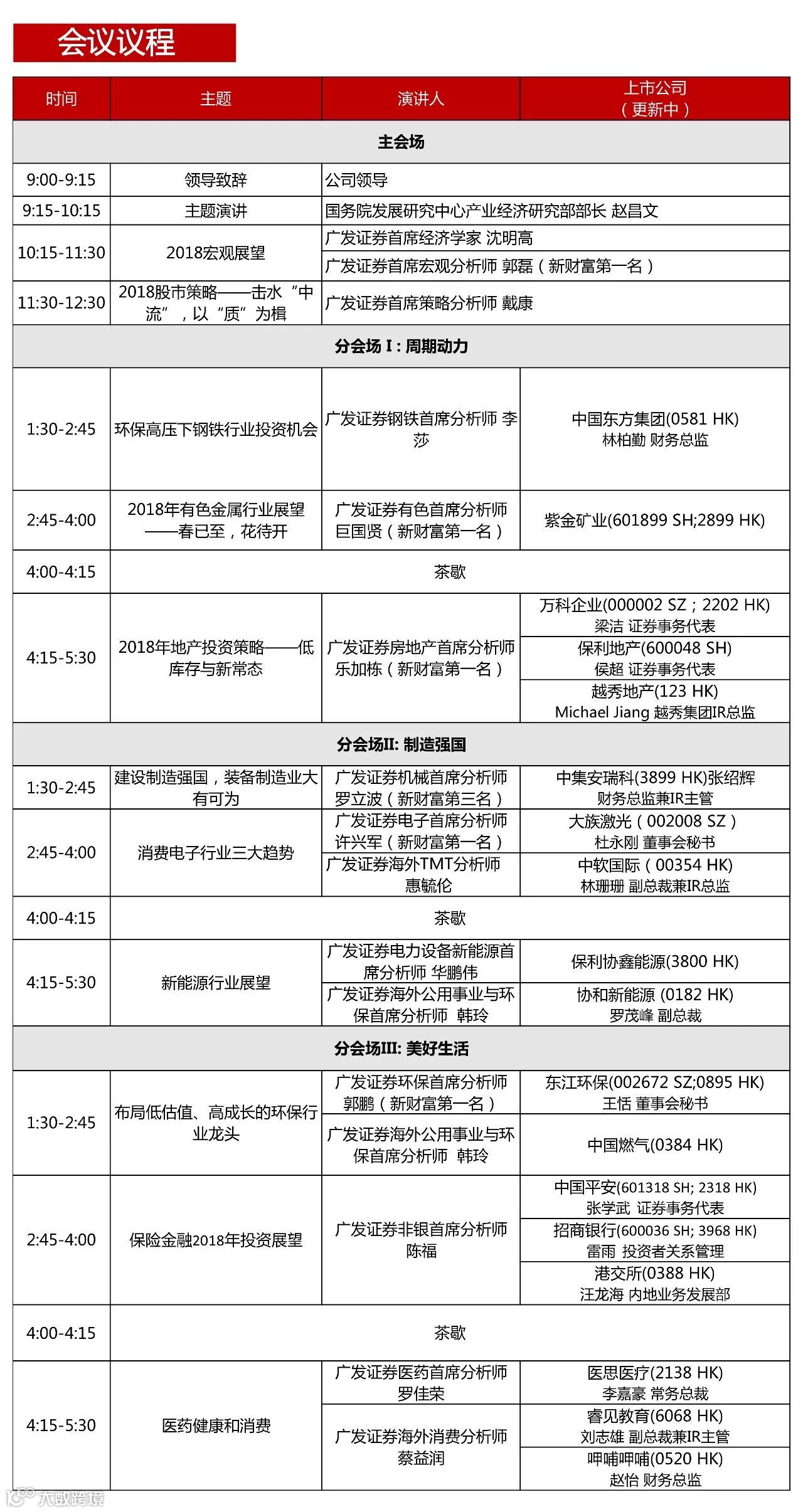 广发证券诚邀各大机构投资者及个人投资者踊跃报名,上午聆听国务院发展研究中心产业经济研究部部长赵昌文和广发证券首席经济学家沈明高的宏观展望,下午三大分会场与众多优秀的分析师及优质上市公司高管零距离沟通,深入了解市场形势及上市公司,精准捕捉未来的投资机会。