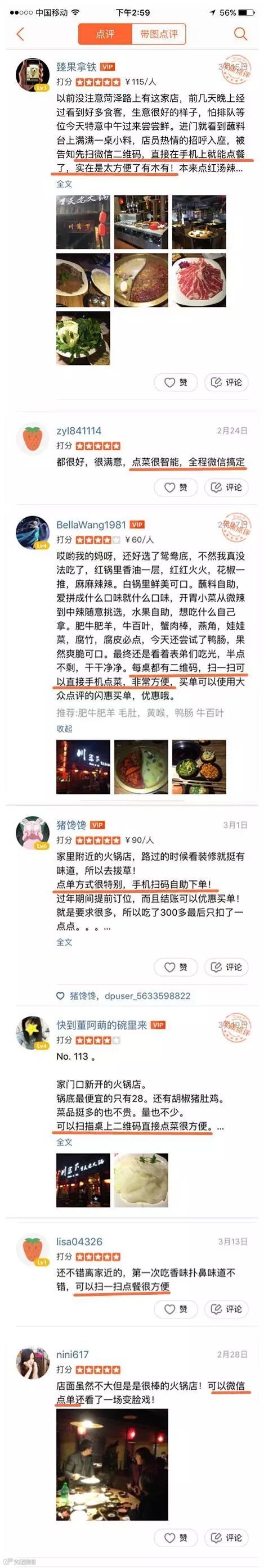 而最让顾客赞不绝口的还数这里的点餐方式。川篱下的每张桌子上都贴上了让人熟悉的二维码,而这些二维码的作用不是打广告也不是搞促销,而是川篱下的“新式菜单”。顾客只要用手机扫一扫餐桌上的这些二维码,就能浏览图文并茂的电子菜谱,并且在选择想吃的菜品后就能立马点击下单,无需等待服务员上桌下单,如此方便快捷的点菜模式让顾客觉得新奇之余更多的感到由衷的便捷。下图是顾客在大众点评上对川篱下的点评。