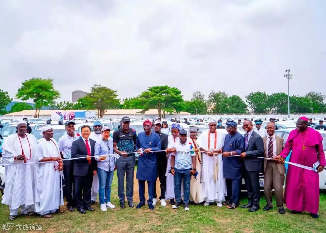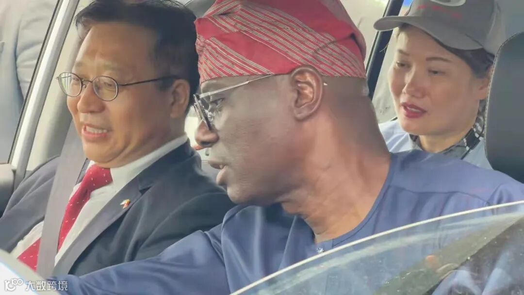 图 | 拉各斯州州长Babajide Sanwo Olu先生、中国驻尼日利亚大使崔建春先生、倬亿国际集团董事长陈秀霞女士,试乘LAGRIDE汽车