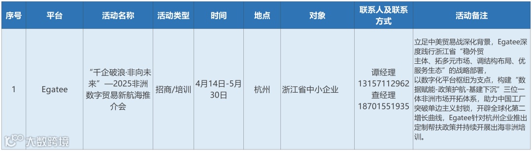 商家专属政策:精选 20000家 非洲优质B端批发商对接浙江企业(年采购总额 200亿以上);零佣金,精准匹配中国工厂;非洲7国海外仓 免租使用6个月;浙江-非洲商贸展厅 免费用6个月(产品陈列+商务洽谈);平台首页开设“CHINA FACTORY”专属入口,企业免费入驻;每月组织非洲商贸考察团(/尼日利亚/肯尼亚/坦桑尼亚/乌干达);参与Egatee现场采洽对接会,提供本地化产品方案现场交付。