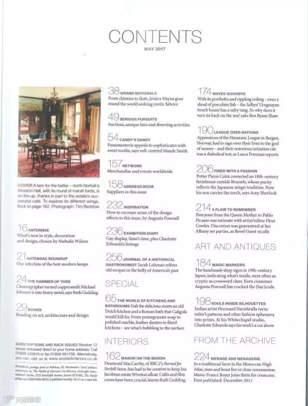 《The World of Interiors》英国室内设计杂志,世界上最具影响力的室内设计和装饰杂志之一,它是设计的专业人士以及爱好者必须要读的佳作,摄影、写作与专家书评,集中抓捕最好的新商品,再加上综合预览和上市的国际艺术展览,给你更多的参考。
