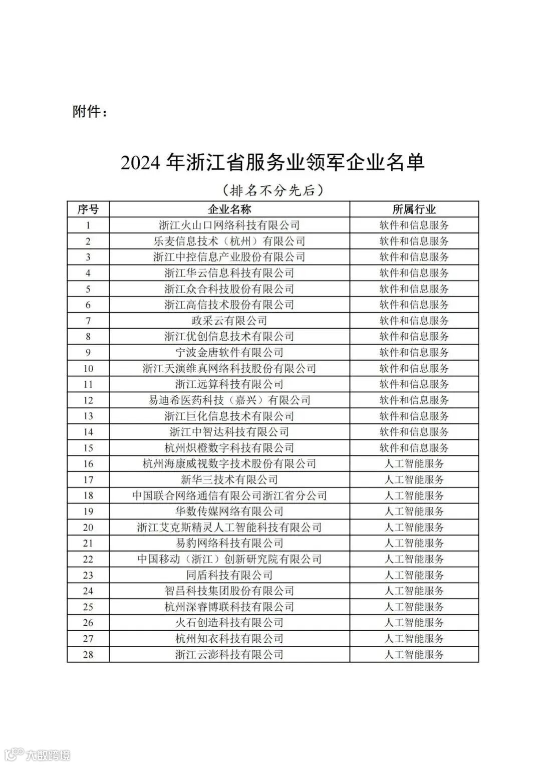 经省政府同意,现将2024年浙江省服务业领军企业名单予以公布。请省级相关部门和有关市、县(市、区)围绕我省现代服务业“六大高地”建设,持续培育壮大服务业领军企业,加快推动形成服务业新质生产力,打造现代服务业强省。