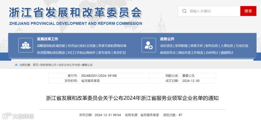 12月31日,浙江省发改委将2024年拟认定为浙江省服务业领军企业的200家企业(单位)名单予以公示,我协会3家会员企业入选名单。分别为: