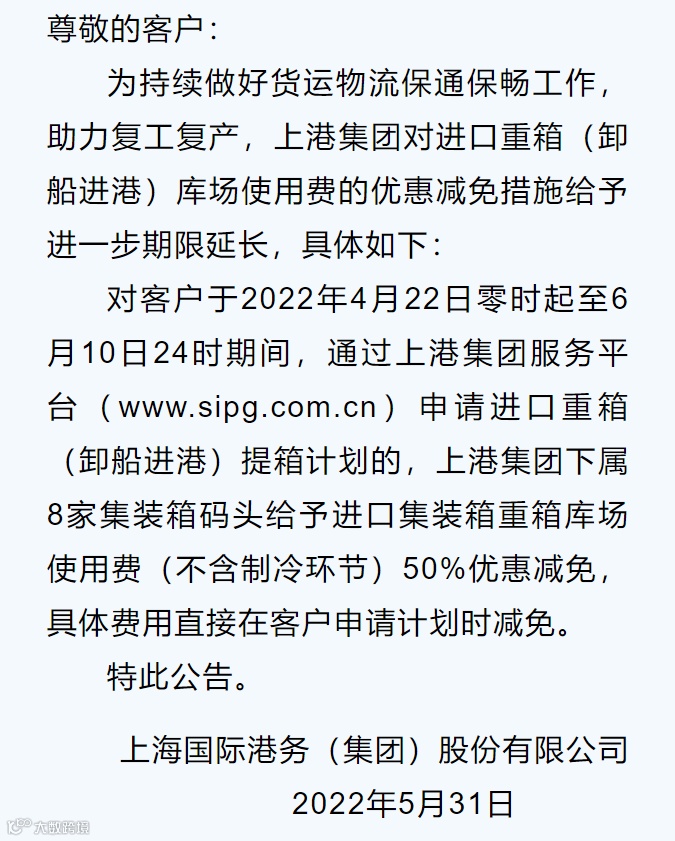 日前,上港集团发布了关于延长进口重箱(卸船进港) 库场使用费减免措施的公告。具体如下:
