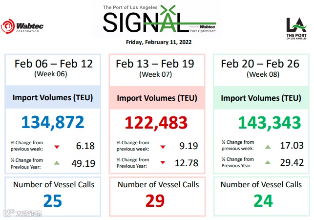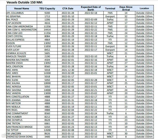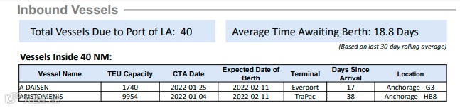 根据洛杉矶港口的Signal数据,截至11日,有40艘船舶排队,其中有38艘船舶在距离港口150海里处徘徊等待泊位,其中包括5018标准箱的“MSC ANYA”已延误了近43天。平均等待泊位时间在经历数周回落后增加至18.8天。