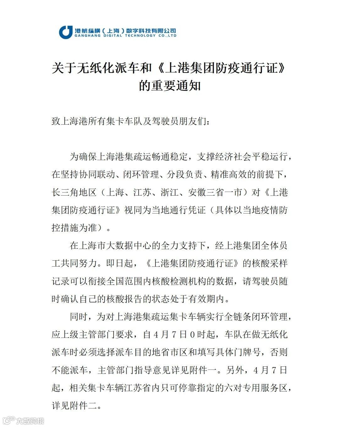 4月6日,上港集团发布“关于无纸化派车和《上港集团防疫通行证》的重要通知”。