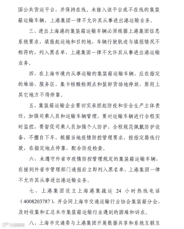 另据上海市交通委员会发布的《关于进一步加强进出上海港集装箱运输车辆闭环管理的通知》,进出上海港的集装箱运输车辆,必须具有有效的《道路运输证》,无有效证件的,上港集团一律不允许其从事进出港运输业务。