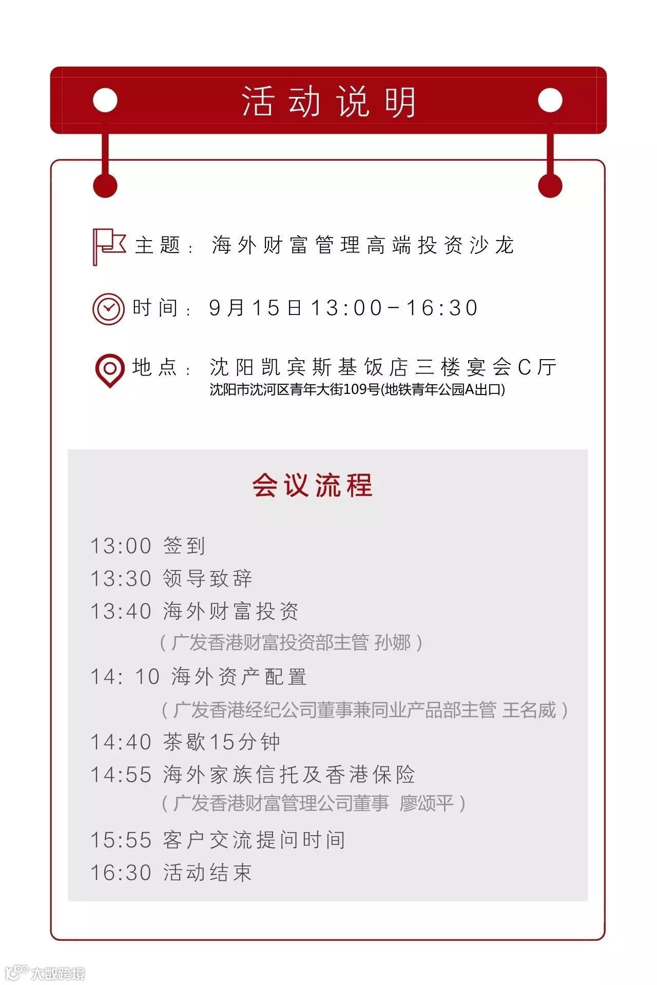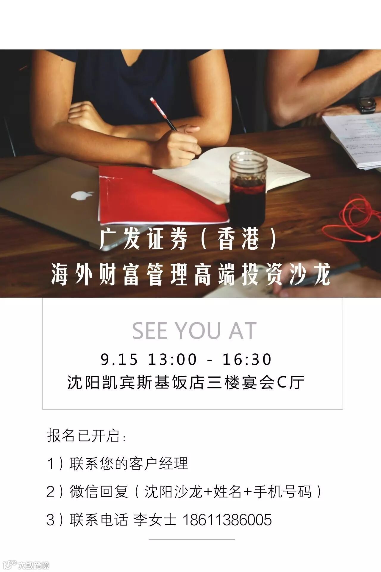 为答谢高端客户对广发证券的长期支持,广发证券(香港)诚邀您参加9月15日13:00-16:30举办的广发证券(香港)海外财富管理高端投资沙龙(沈阳)活动。广发证券(香港)财富管理团队致力于向境内外投资者提供更丰富、优质、专业的服务与支持,将与您一同展望下半年经济形势、剖析投资新机遇。