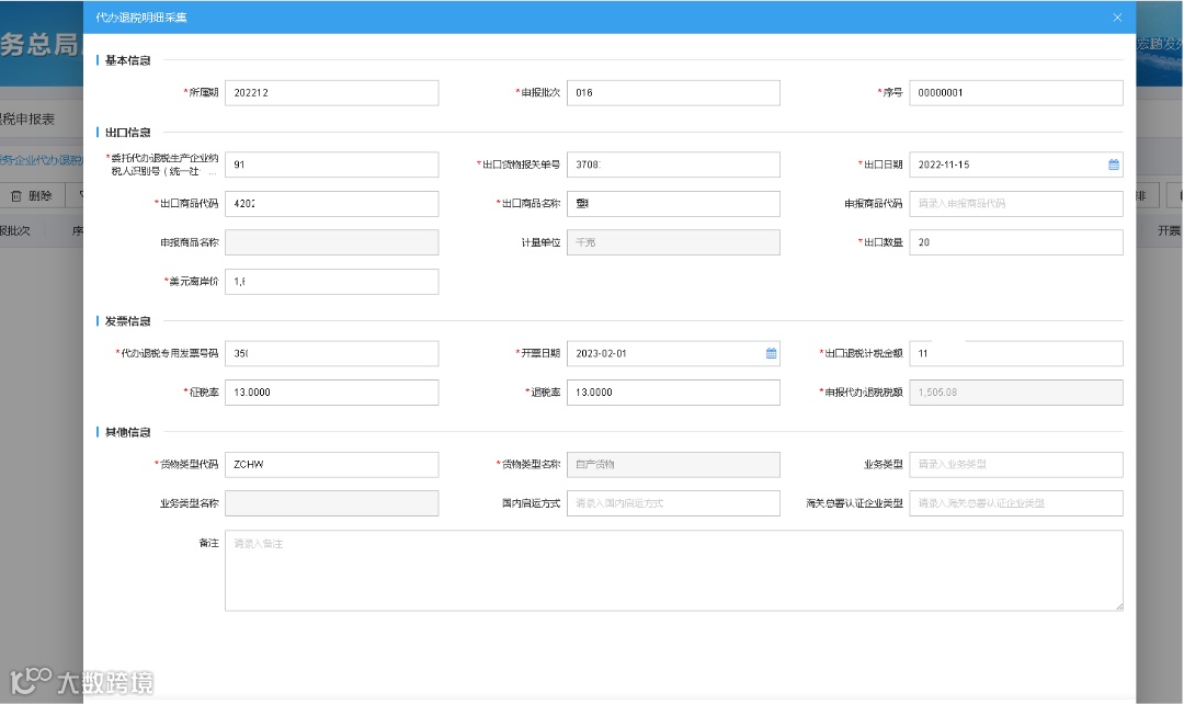 特别提醒:代办退税明细表与出口退(免)税不同,出口信息和进货信息都在同一张明细表中采集。