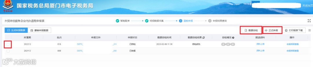 勾选表中生成的数据包,点击【数据自检】,自检无误以后点击【正式申报】。
