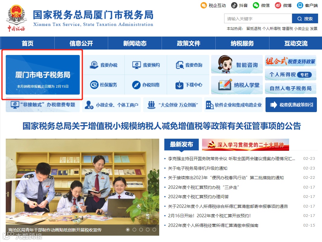 登录国家税务总局厦门市税务局网站,点击主界面左边的蓝色方框“厦门市电子税务局”,点击进入后,输入企业账号和密码,完成登录。