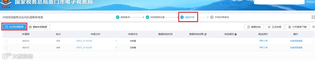 明细采集全部完成以后,进入【退税申报】界面,退税申报,点击【生成申报数据】。