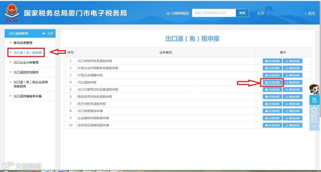 进入出口退税管理界面后,选中左边菜单栏【出口退(免)税申报】,选择右边第四项【代办退税申报】,点击【在线申报】,即可进入【外贸综合服务企业代办退税申报表】。