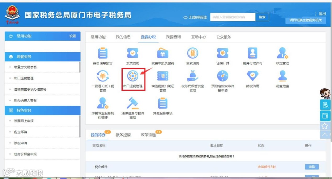 登录成功后,选择上方检索栏【我要办税】,点击进入【出口退税管理】界面。